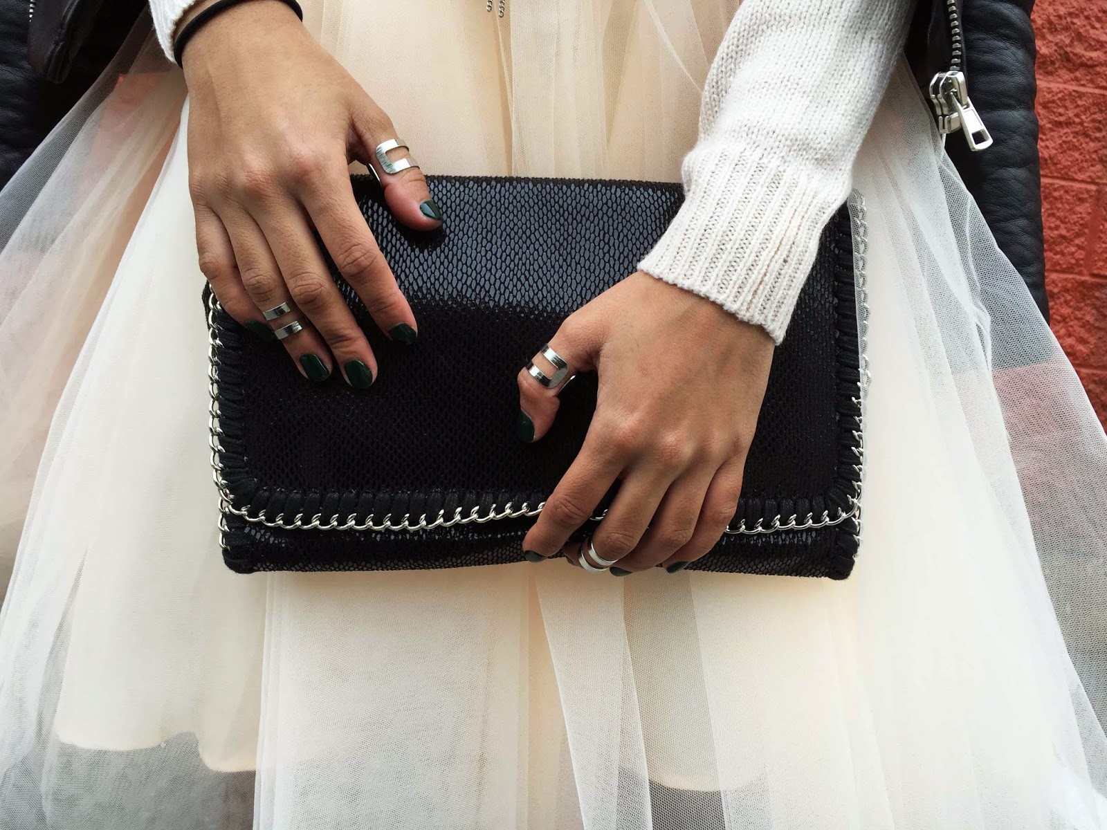 Accessories: Silver Ring Set sold at H&M | sold out, Silver and Black String Long Necklace made by Tildon sold at Nordstrom sold out , Black Lizard Chain foldover Clutch by Phase 3 available at Nordstrom