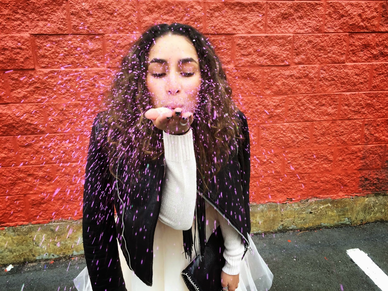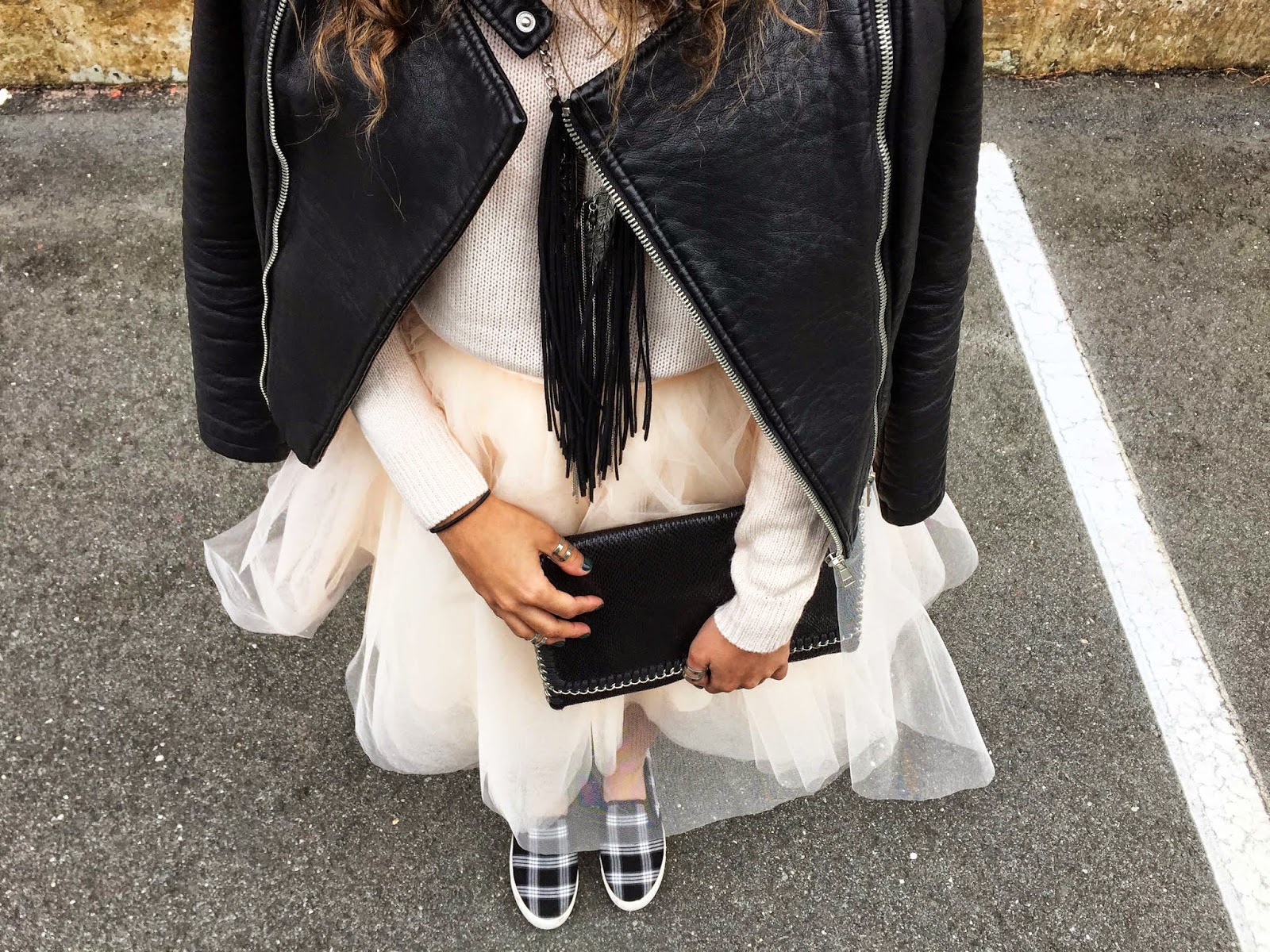 Hi my friends! While I shot this look a few weeks ago and meant to post it to the blog, it makes a great rock n' roll ballerina look. This look is great for date night because it mixes those soft elements with the hard/dark elements. I am a sucker for a good tulle skirt, regardless of the length (the one I am wearing is a 25" skirt that falls right above the knee). I bought this skirt as an everyday piece but its also great for dressing up for a date night! I featured the blush skirt with a knit sweater which happened to be the same color, which both consist of the soft elements of the outfit. For the hard elements, I chose to wear a black leather biker jacket, a long silver with black string necklace, a lizard chain folder clutch, silver rings, and last but not least black and white plaid slip on sneakers. Some people may think that tulle skirts can only be worn with soft and pretty elements but its great to change up a "typical" tulle look with those chic pieces! Whether you chose to stay pretty or be chic for date night they are both amazing choices for a night out with your lover or friends! Details for this tulle look are below!